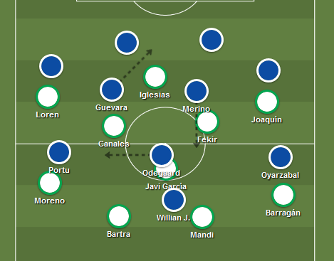 Como anunciamos hace muchos meses, un fútbol de ida y vuelta acabaría con la carrera de Joaquín, más aún al cumplir el rol, muy sacrificado, de extremo de un 4-2-3-1. Se le vio desquiciado y descolocado. Canales también lució poco. Fekir sigue mostrando una calidad tremenda en el desborde y sigue dando sensación de estar muy mal colocado en ataque: regatea donde no hace daño. Borja sigue desacertado, y ni baja balones ni los mete.